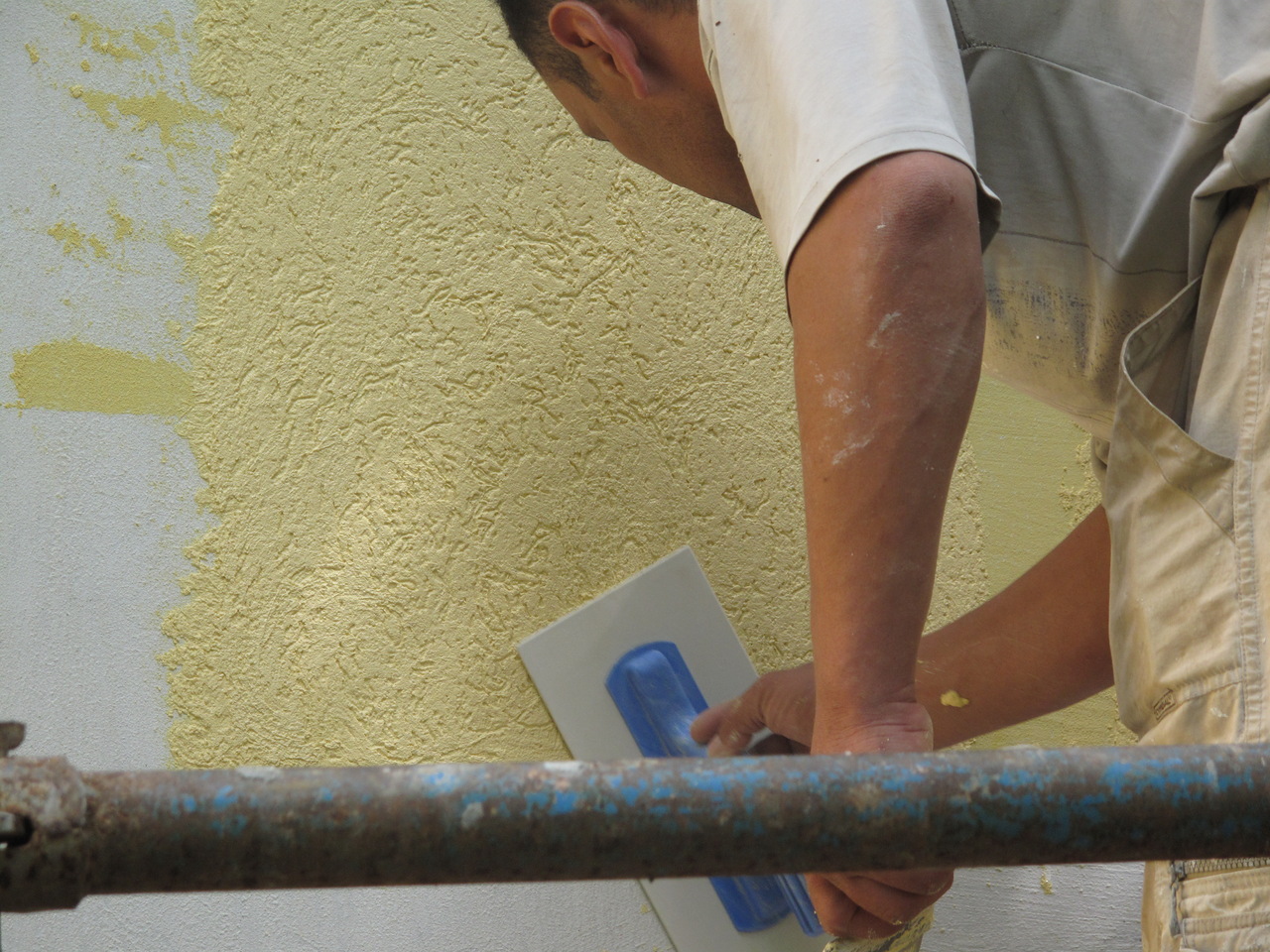 Третий слой — накрывка, толщиной 1,5-2 миллиметра, наносится после затвердевания предыдущего слоя на предварительно смоченную поверхность и волнообразными движениями разравнивается по поверхности при помощи полутерка или широкого шпателя.