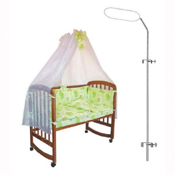 Крепление аксессуара к кроватке происходит с помощью специальных деталей – держателей – крепких опор или кронштейнов, изготовленных из пластика или металла. По внешнему виду представляют собой кольцо или овал, расположенный на специальной стойке (трубке) с приспособлением, к которому крепится колыбель.