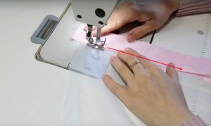 Пристрочите полосы отделки к краю тюля. Проследите за тем, чтобы строчка не сборила ткань. После прострочки разгладьте шов и сложите полосу ткани пополам. Загладьте утюгом. |