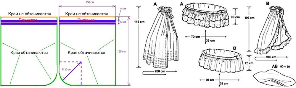 Учтите, что балдахин, при всей воздушности сооружения, требует довольно большого расхода ткани. Вот несколько примерных выкроек.