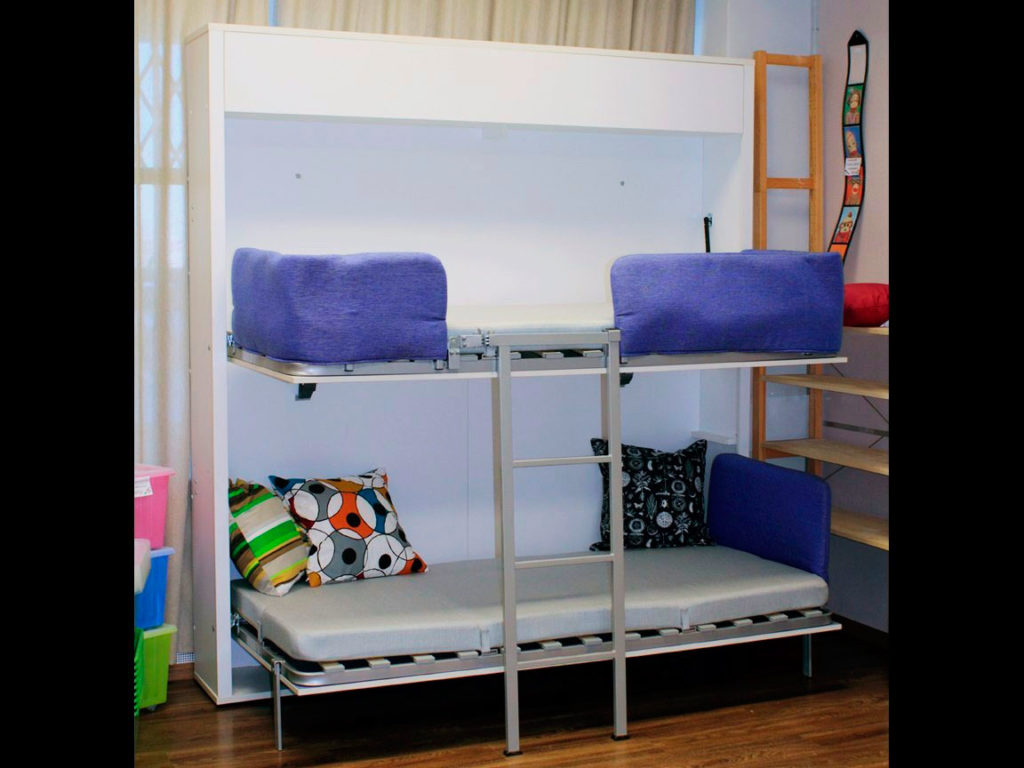 Откидная двухъярусная кровать является системой из двух односпальных коек, объединенных лестницей и идентичной системой трансформации. Рекомендованная ширина спального места для детей и подростков составляет 70-90 см. Нижняя койка будет прятаться в пространство между ярусами, тогда как второй этажа придется подымать вверх.