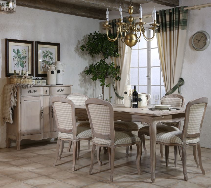 Для кухни. Массивный буфет, круглый или овальный стол из дерева, окруженный резными деревянными стульями, сервант, словно «привет из прошлого века» — все это классика меблировки кухни в прованском стиле. На открытых полках, просто окрашенных светлой краской и развешенных на стенах, расставлены декоративные тарелочки, статуэтки, фарфоровый чайный сервиз.