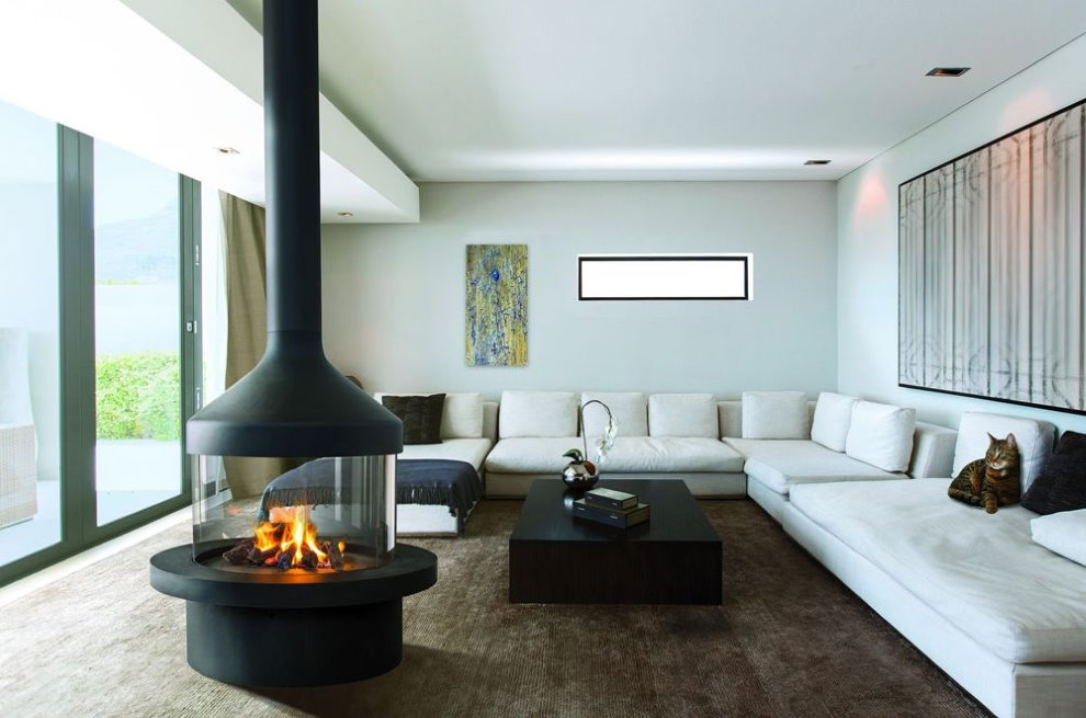 панорамный камин используется для разделения пространства — часто размещаются в центральной части, иногда для удобства перемещения имеет специальные ножки с колёсами;