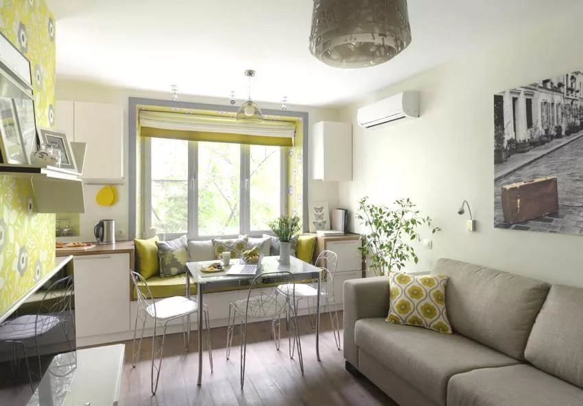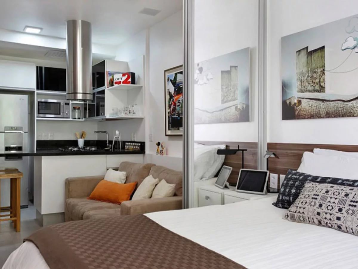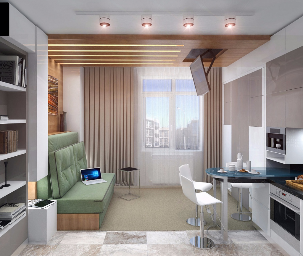 Несмотря на небольшую площадь помещения, квартиру в 25 кв. м легко превратить в полноценное бунгало современного человека, в котором есть кухня, гостиная и спальня. При желании гостиную и спальню запросто можно совместить, обустроив необходимой мебелью.