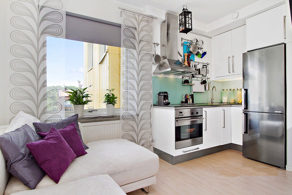 Для маленькой квартиры-студии идеально подойдет интерьер в скандинавском стиле. Сразу после коридора у левой стены установите белый кухонный гарнитур, состоящий из напольных и настенных шкафов. У правой стены можно поставить холодильник, чтобы сэкономить место.