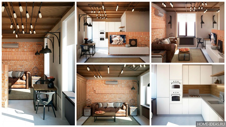 В такой планировке будут гармонично смотреться стены с кирпичной кладкой, а также белый пол и потолок. Мебель следует подбирать в светлых тонах и местами разбавлять обстановку яркими деталями. Например, это могут быть желтые светильники, разноцветные ящики столов и контрастная полоска на кухонной стене.