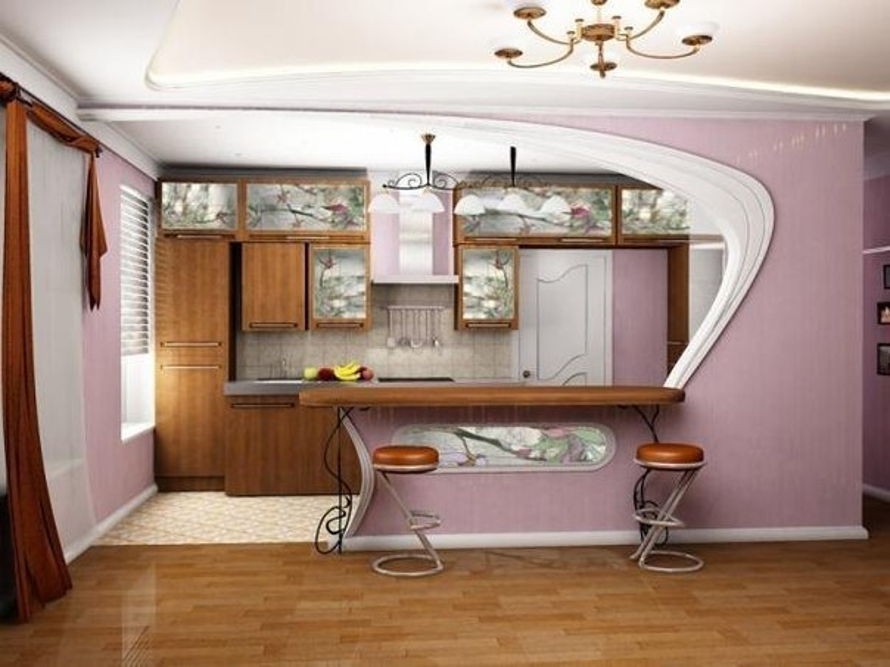 - Кухонный гарнитур с барной стойкой разграничит кухню с другим простором. Стойка – это место для принятия пищи, как минимум два человека за ней точно поместятся.