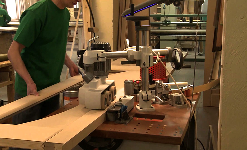 С помощью фрезера диаметром 14 мм вырезают отверстия под петли. Вначале аппарат настраивают непосредственно по ширине петли. Далее вырезают центральную и крайнюю часть слоя материала именно под петли. В местах, где фрезер оказался бессильным (не удалил слой), подойдет использование стамески. Последняя поможет вырезать соответствующие проемы для петель.