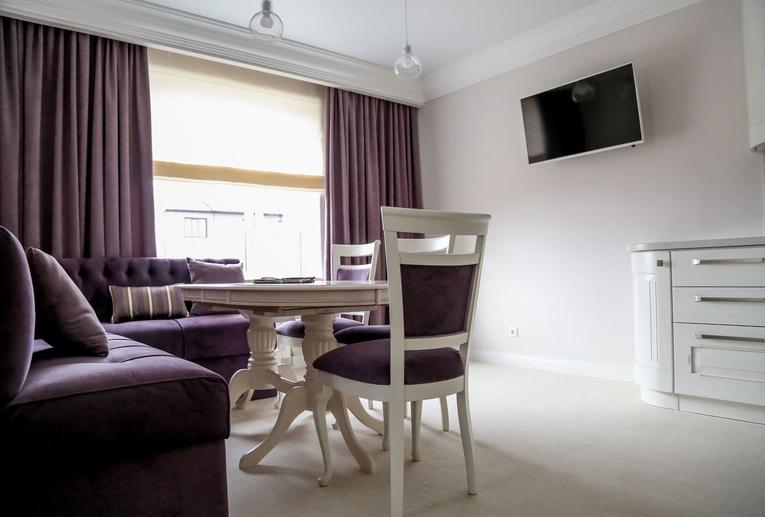 - Гостиная в сиреневых тонах вызывает ощущение особой воздушности пространства. Здесь будет уютно собираться с близкими родственниками и друзьями, проводить время уединённого отдыха, мечтать о будущем и заниматься творчеством.