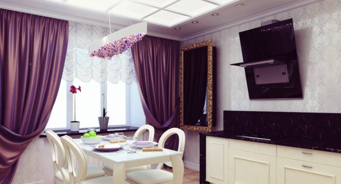 Для кухни дизайнеры рекомендуют подбирать “легкие” окраски, такие как лавандовый, сиреневый или же лиловый. Также в кухню хорошо подойдут по назначению рулонные шторы. Текстура материала так же как и в случае с детской комнатой не должна быть грубой, а наоборот придавать больше бархатности и воздушности интерьеру. Для гостиной стоит также придерживаться советов, указанных выше и не пренебрегать общими рекомендациями (придерживаться баланса света и тонов). Чтобы в гостиной комнате не было темно необходимо использовать занавески не из грубой ткани или грамотно сочетать и то и другое, а разрядить обстановку помогут различные детали в виде фото, статуэток и декора.