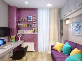 Сочетание тон в тон – особенно удачный выбор для небольших комнат. Контрасты лишь создадут ощущение тесноты, а вот прозрачные однотонные оттенки (бледно-сиреневый, лавандовый) расширят пространство. Комната будет выглядеть изысканно и свежо.