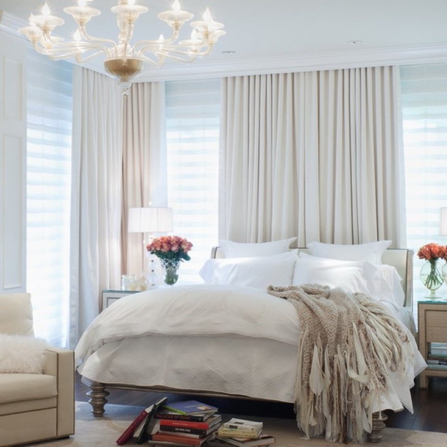 Фиалковые гардины очень изыскано будут смотреться на фоне бежевых или персиковых стен. Добавьте белую мебель и получите спальню для королевы.