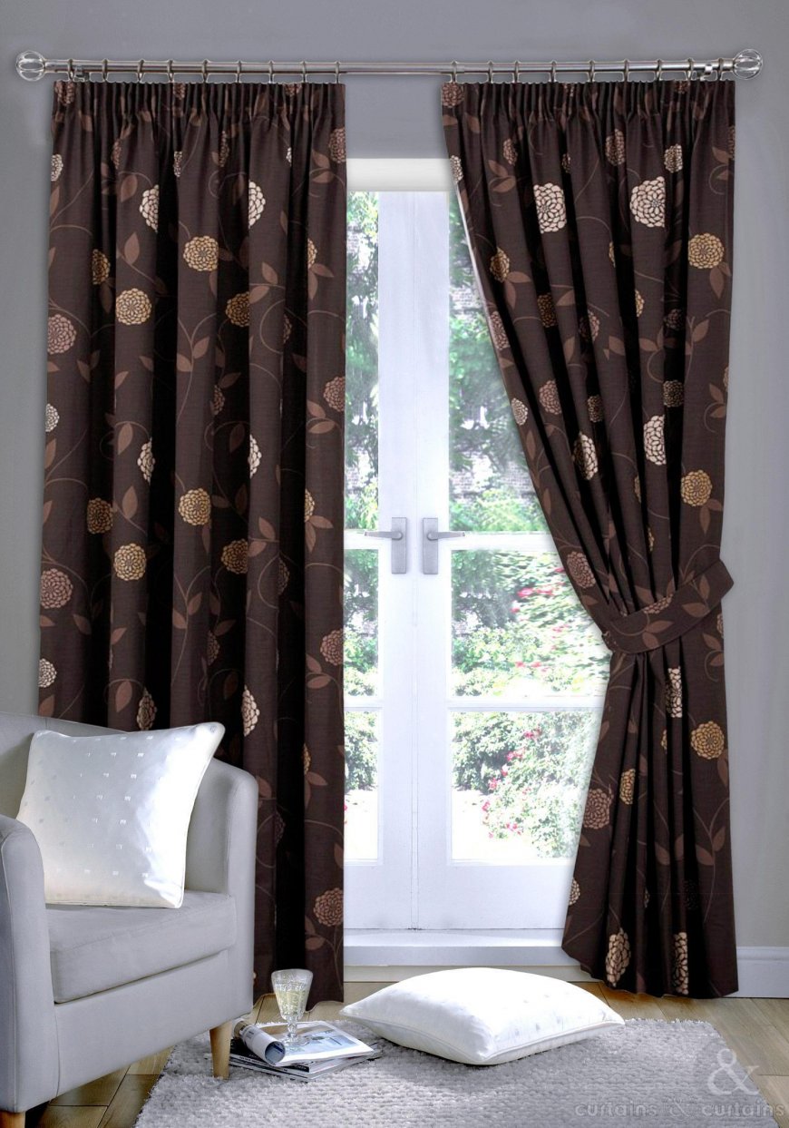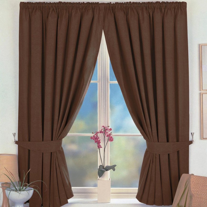Шторы песочного цвета хорошо смотрятся с коричневыми стенами. Можно использовать несколько слоев занавесок, включающие в себя разные кофейные оттенки. Рекомендуется разбавить коричневые шторы бежевым цветом, в результате получится объемная составляющая интерьера.