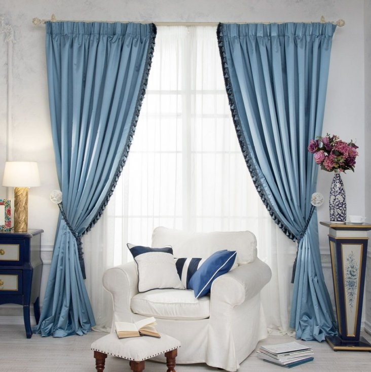 Если окна гостиной смотрят на север, оптимальными считаются шторы светло-синего оттенка.