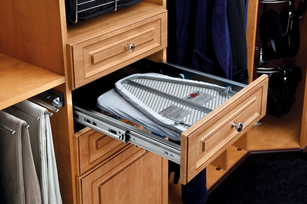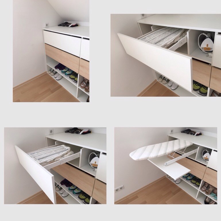 Широкий элемент монтируется внутри ящика. После использования гладилку можно буквально одним движением вернуть на место. Размер доски ограничивается габаритами комода.