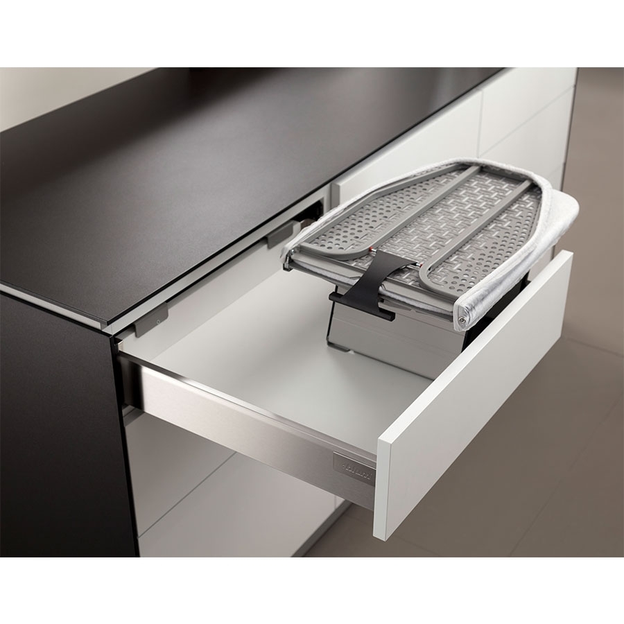 - Раскладная гладильная доска, которая прячется в выдвижной ящик. Он может быть установлен на кухне, в ванной или же в комнате. То есть внутри этого выдвижного ящика имеется специальный механизм, который позволяет увеличивать длину и непосредственно каркас. После выдвижения полотна раскладывается гладильная доска.