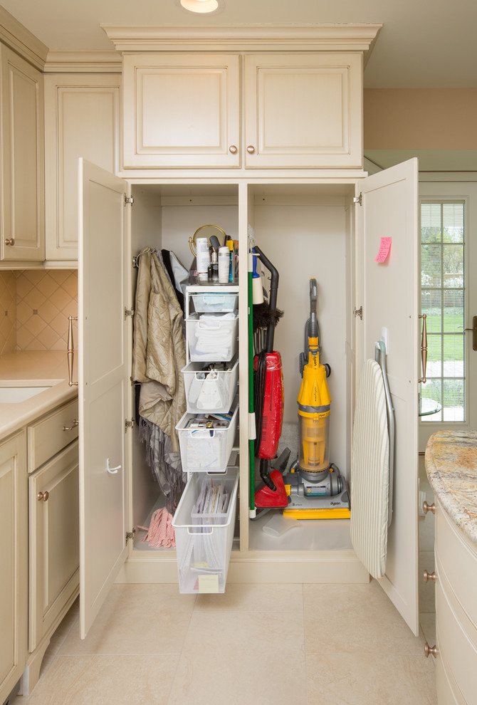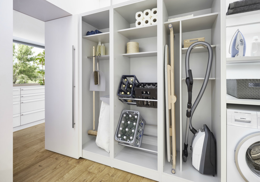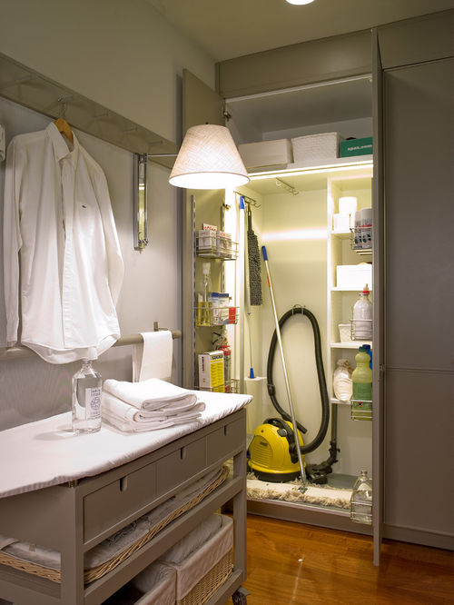 Абсолютно каждая большая семья нуждается в таких простых вещах, как сушилка для белья, гладильная доска, утюг, пылесос, посудомоечная и стиральная машина. И если некоторые объекты скрыть от всеобщего обозрения невозможно или нет необходимости, то какие-то из них выставлять напоказ как минимум неэстетично. Поэтому и появляется нужда в создании пространства для их хранения.