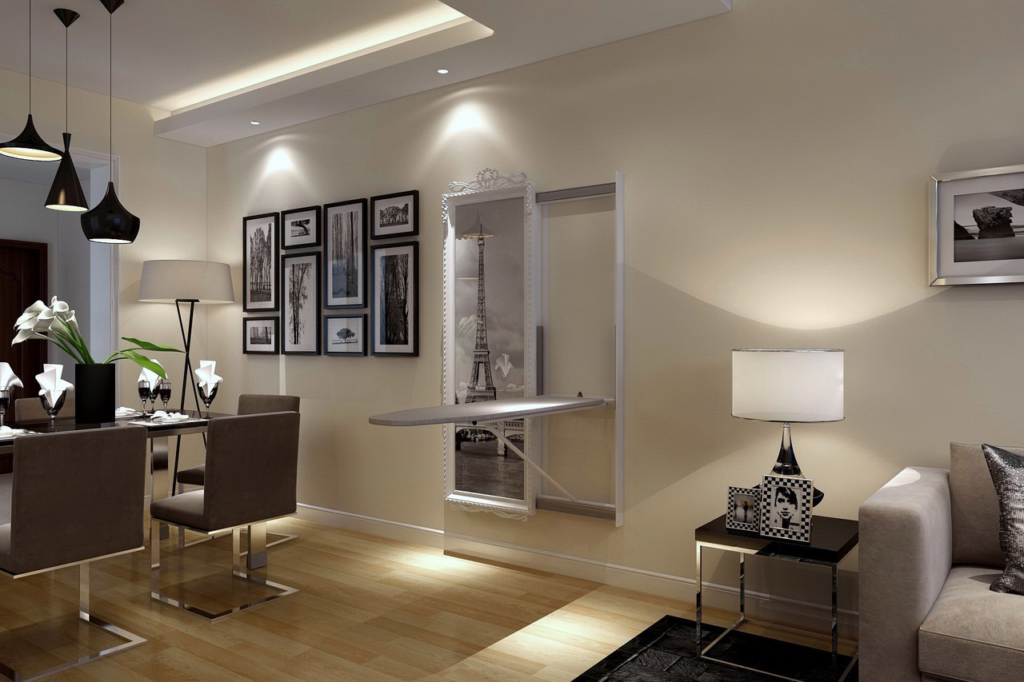 Кроме того, такой аксессуар выбирают люди, любящие минималистичный дизайн в комнате. Соответственно они терпеть не могут, когда подобные вещи стоят у стенки и не хотят тратить время на их раскладывание. Это действительно отличный вариант, если у вас ремонт в комнате в стиле хай-тек или модерн, минимализм, лофт. В такой дизайн гладильная доска не вписывается.