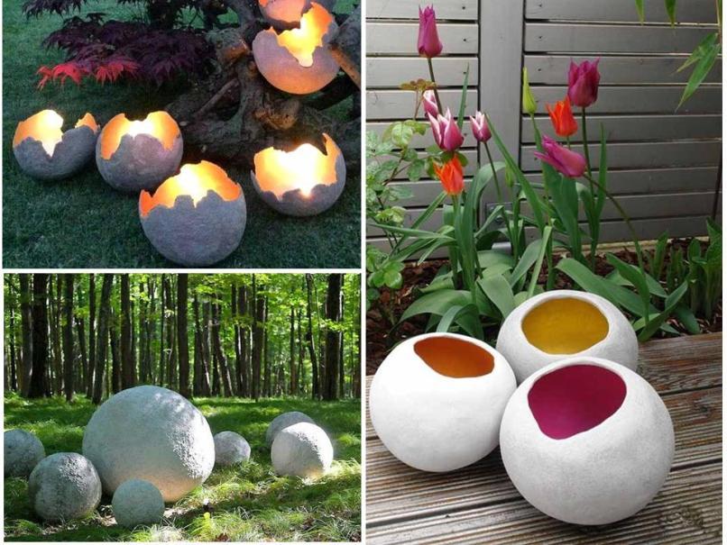 Используя воздушный шарик в качестве формы, можно изготовить своими руками светильники для сада, кашпо в виде шара или декоративные бетонные шары.