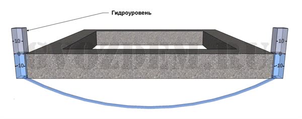 Для начала нужно определить насколько ровная относительно уровня земли у нас получилась горизонтальная поверхность фундамента? Для этой цели мы воспользуемся гидроуровнем и проверим в первую очередь углы, а затем весь периметр по фундаменту. (во время наполнения гидроуровня водой следите, чтобы в трубке не было пузырей, иначе измерения могут быть не точными).