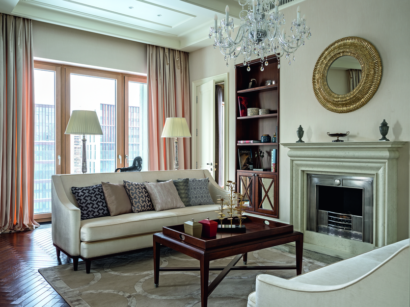 Диван, кресла, Softhouse. Журнальный столик, Luxdeco. Люстра, бра, Visual Comfort & Co. Фото: Евгений Лучин.