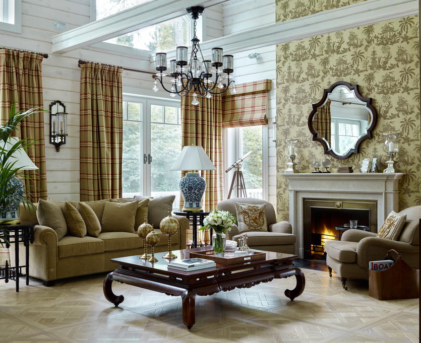 Это интерьер загородного дома апеллирует к британским колониальным мотивам — мы видим сдержанную цветовую гамму, кресла в клетку у камина с латунными деталями, “китайские лампы” и опиумный столик из махагони.