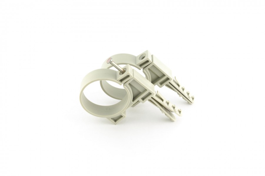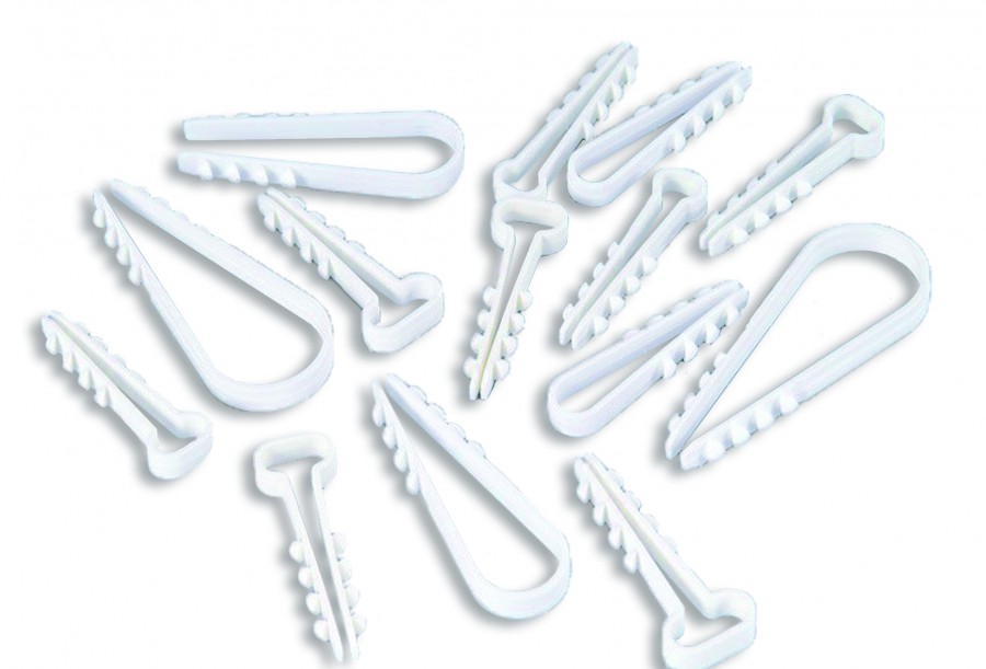 Пластиковые дюбель-хомуты рассчитаны на крепление кабеля к стене диаметром до 25 мм. Петлевидные элементы изготавливают чаще всего из нейлона. Их применяют для того, чтобы закрепить провода на вертикальных ограждениях. На внутренней стороне скобы изготовитель часто указывает диапазон размеров поперечного сечения кабеля или группы проводов. Например, надпись 11-18 мм означает, что хомут не удержит проводник диаметром 20 мм.