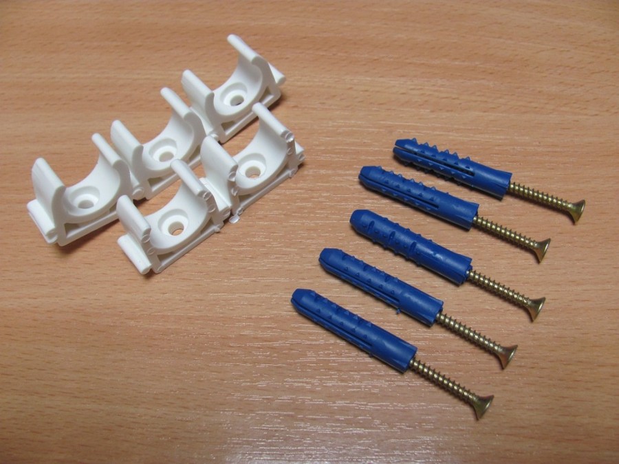 Применяют в основном для монтажа кабелей в гофрах для скрытой и наружной прокладки. Для различных диаметров труб имеются соответствующие размеры клипс. На бетонные стены их монтируют при помощи дюбелей, а на деревянные поверхности – с помощью обычных саморезов.