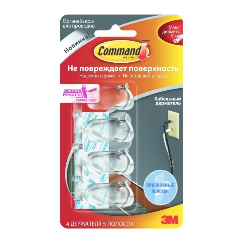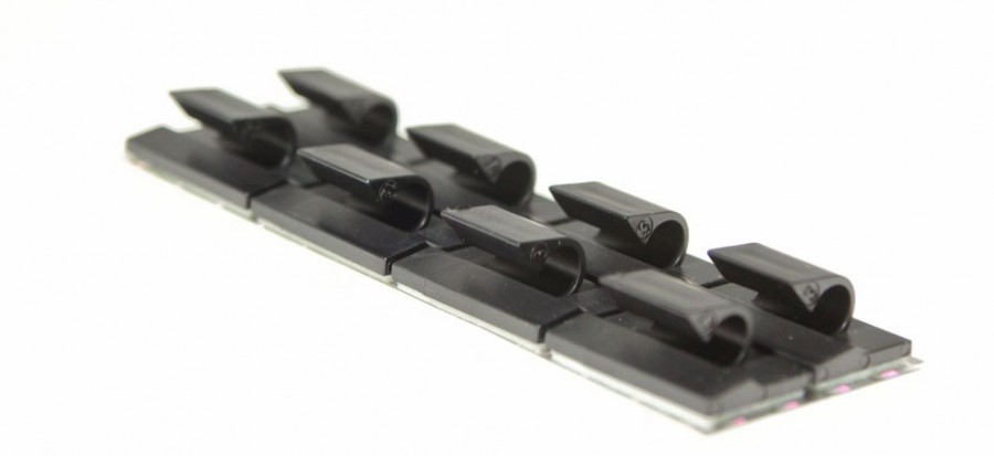 Применяют для крепления кабеля или провода различной формы, могут быть выполнены в пластиковой или металлической форме. Поверхность, куда она будет крепиться, должна быть очищена от всякой пыли и грязи. У клипсы на тыльной стороне имеется односторонняя липкая лента. Такой крепеж применяется для крепления кабеля на пластиковые панели или мебель. Отпадает необходимость в сверлении отверстий в дорогостоящих или хрупких материалах.
