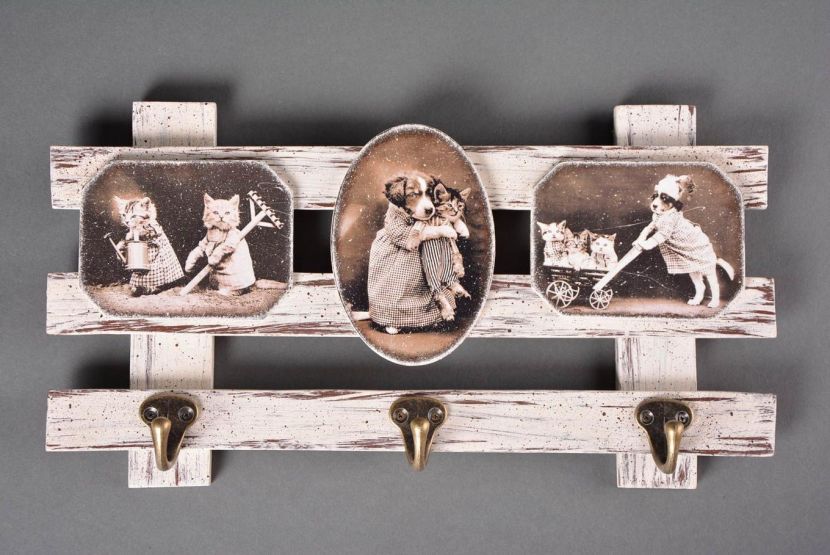 На обработанную деревянную поверхность после ее полного высыхания прибиваются крючки. Можно использовать одинаковые крючки, но разные по цвету, или форме, или материалу изготовления крючки придадут вашей ключнице некую неповторимость.