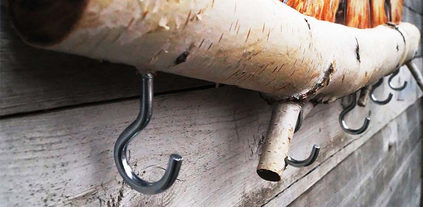 Деревянный отрезок лучше всего взять от дуба. Материал будет более прочным. Тем не менее можете взять ветки и других деревьев. Главное, чтобы они смогли выдержать нагрузку от инструментов, а крючки свободно вкручивались в древесину и хорошо держались в последующее время эксплуатации.