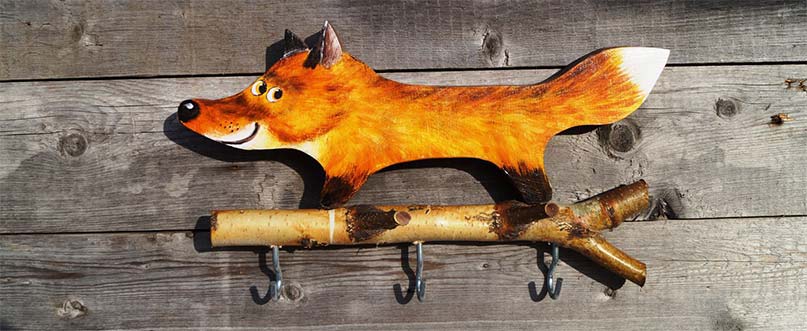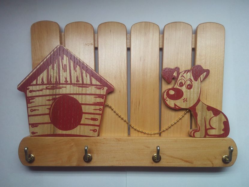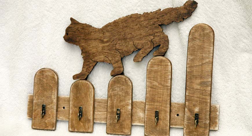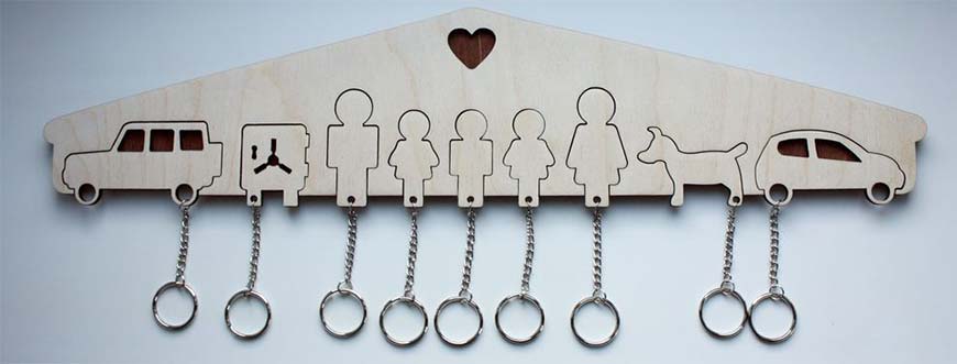 Использование фанеры сократит время работы. Главная задача – это придумать интересную фигуру для ключницы. Можно вырезать большой ключ, таксу, мышку, спящего кота. Поверхность фанеры в отличие от дерева не требует обработки. Все что нужно сделать, это отшлифовать места вырезания (края фанеры). Чтобы они были гладкими, их покрывают краской. Последний шаг – прикрепить крючки в строгом порядке или хаотично.