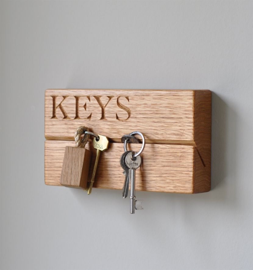 Необычно будет увидеть ключницу без крючков. Для ее изготовления используют дерево. Фокус заключается в том, что ключи не вешаются, а вставляются в щель. Сделать такую щель в деревянной основе не трудно. Вырезать щель можно ровно по горизонтальной линии, а можно сделать с уклоном острого угла к стене. Для этого нужен фрезерный станок или циркулярную пилу. Можно аккуратно добиться неплохого результата и обычной пилой. Сделанные щели необходимо тщательно обработать.