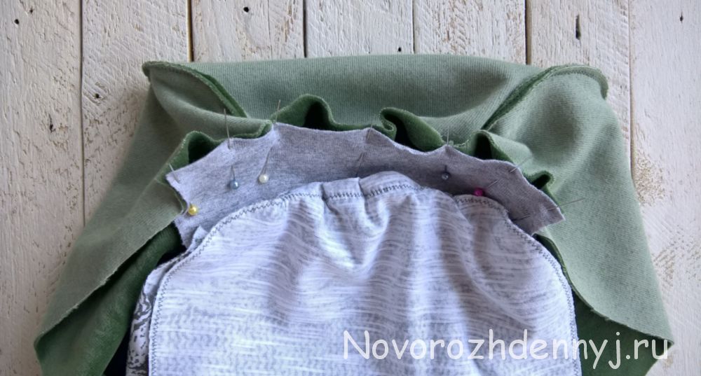 - К подкладочному вырезу горловины (от одной полочки через спинку к другой полочке) приложите деталь из рибаны, разместив обе ткани лицевыми сторонами друг к другу. Немного растягивая горловину из рибаны, зафиксируйте ее на подкладке булавками.