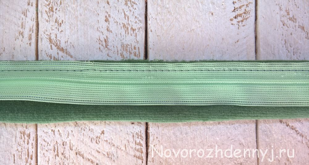 - Верхний закругленный край планки послужит защитой от верха молнии, поэтому его нужно будет завернуть, окутав молнию. Сделав это, зафиксируйте верх молнии и верх планки булавкой, а затем прикрепите булавками молнию к планке по всей длине.