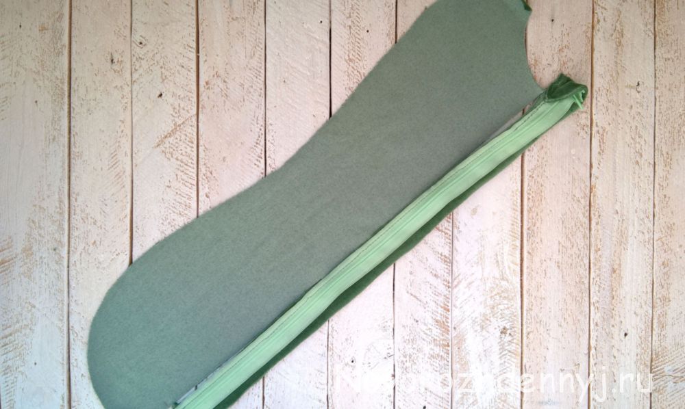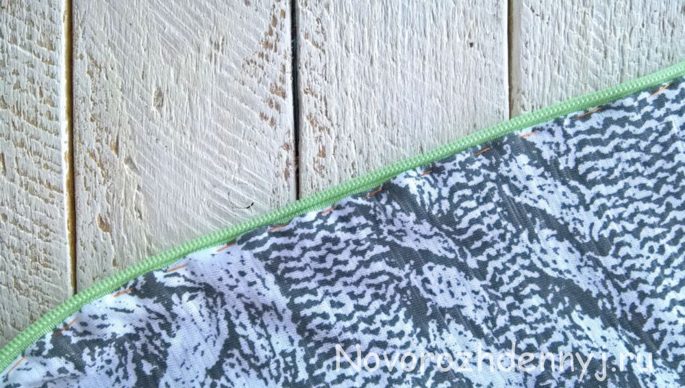 - Прострочите прямым швом только что намеченную линию по лицевой стороне кокона. В отличие от этой стороны, молния на другой полочке осталась не отстроченной (ее вы пришивали с изнанки, поэтому шва на лицевой стороне не видно). Чтобы обе полочки выглядели симметрично, по первой из них пройдитесь прямым швом – отстрочите молнию близко от ее края.