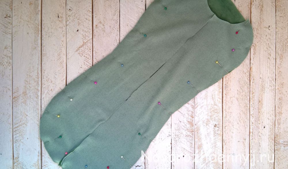 - Сложите вместе спинку из основной ткани и сшитые внизу полочки, сколите их булавками по всему периметру (кроме горловины).