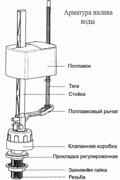 • наливной клапан регулирует количество воды в баке. Как только поплавок в нём достигает нужного уровня, подача воды прекращается;