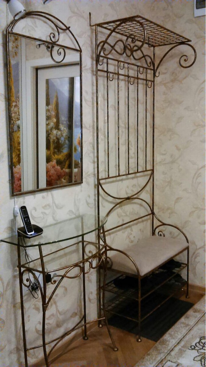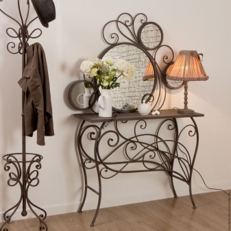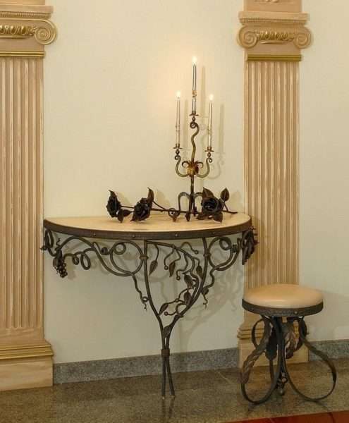 Кованная мебель для прихожей может быть и в виде мягких пуфиков с металлическими полками, кованной тумбочкой, галошницы, ключницы, консоли. Последняя представляет собой пристеночный узкий стол, у которого либо две, либо четыре кованные ножки.