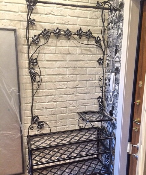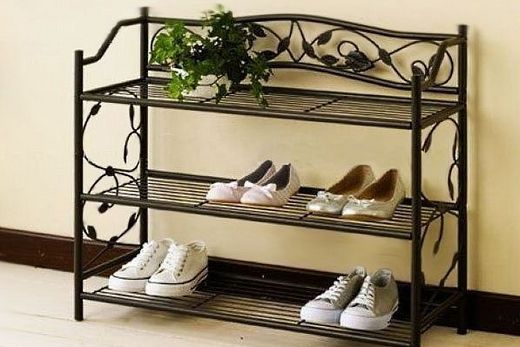 Какая же кованая мебель для прихожей интересна дизайнерам? Они советуют учесть, что коридор начинается с вешалки для верхней одежды и с полки для хранения обуви. Практичная и надежная кованая мебель в прихожую, как на фото ниже, в виде простой полочки для обуви с несколькими рядами будет как нельзя кстати уместна и полезна.