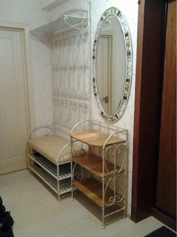 Мебели не должно быть много – достаточно установить в прихожей кованые полки (на верхнюю можно складывать головные уборы, а на нижнюю – обувь), вешалку, небольшую деревянную тумбу с зеркалом, заключенным в кованую раму.