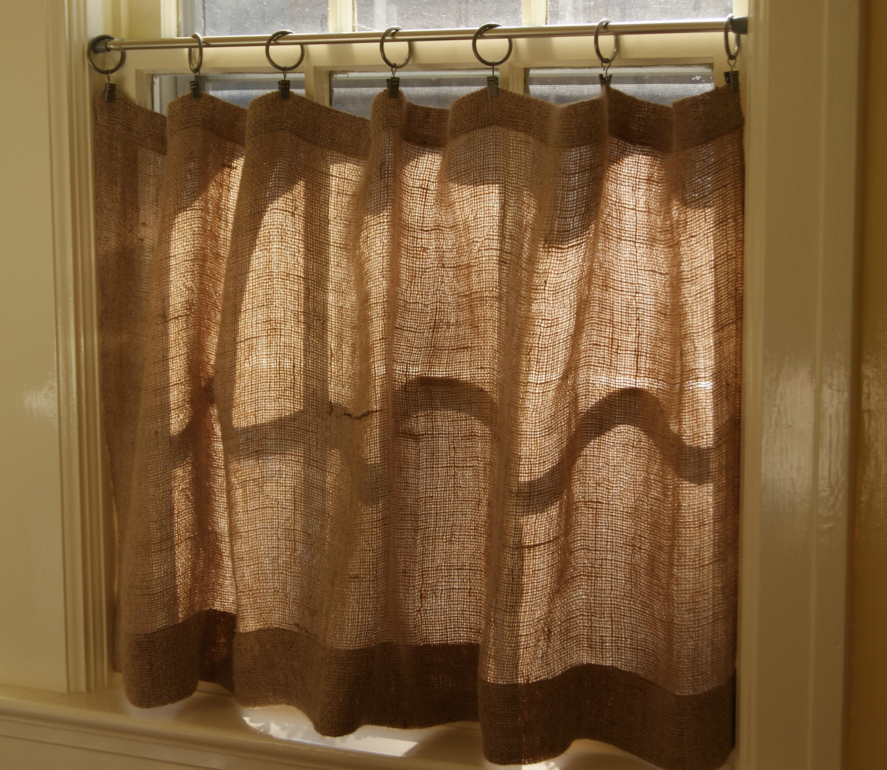 Если поиски оригинальной идеи для оформления окна не дают успехов, тогда следует присмотреться к варианту из мешковины. Декор таким материалом может быть самым неожиданным и, безусловно, будет нести в себе «изюминку» Структура материала не будет препятствовать попаданию солнечного света в помещение, но при этом личная жизнь хозяев останется секретом для посторонних глаз.