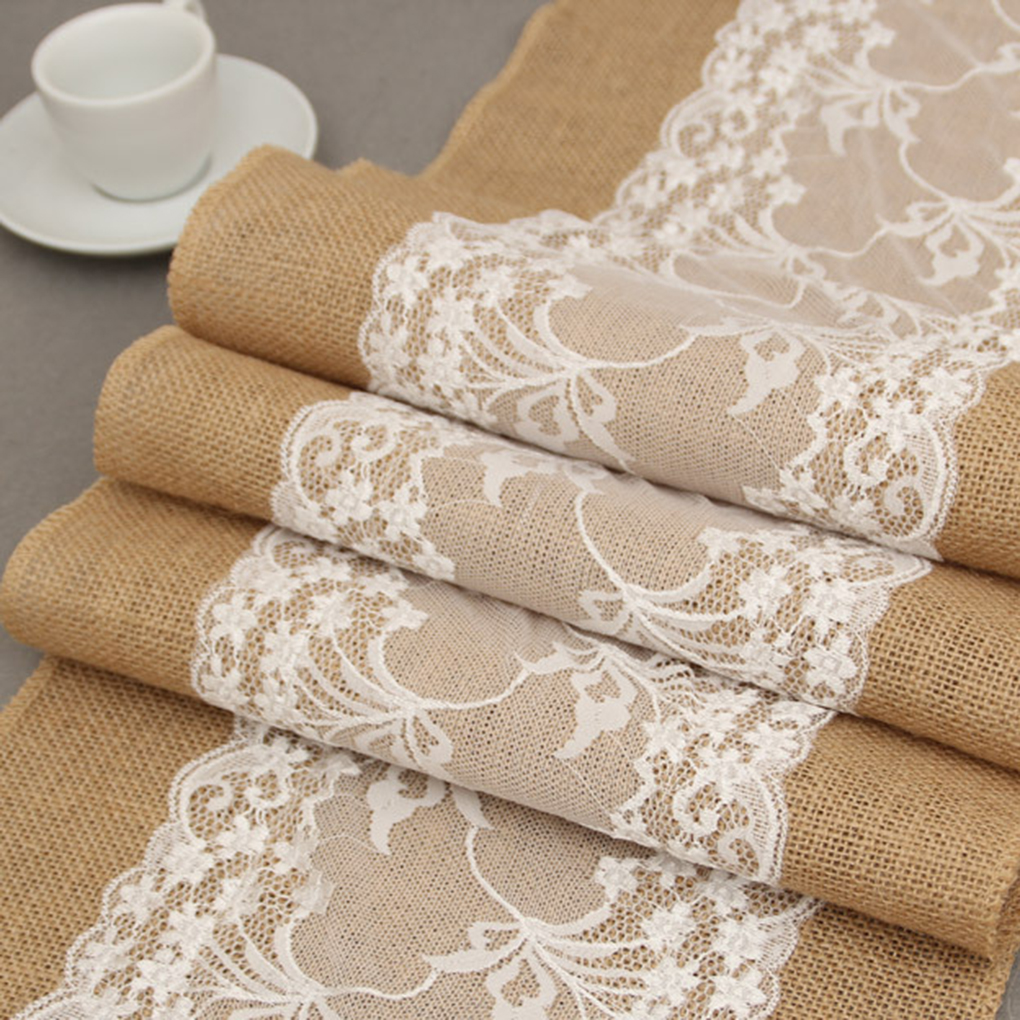 Как вариант скатерти на стол, мешковину часто комбинируют с кружевом. Такой элемент привносит нотку нежности в образ помещения.