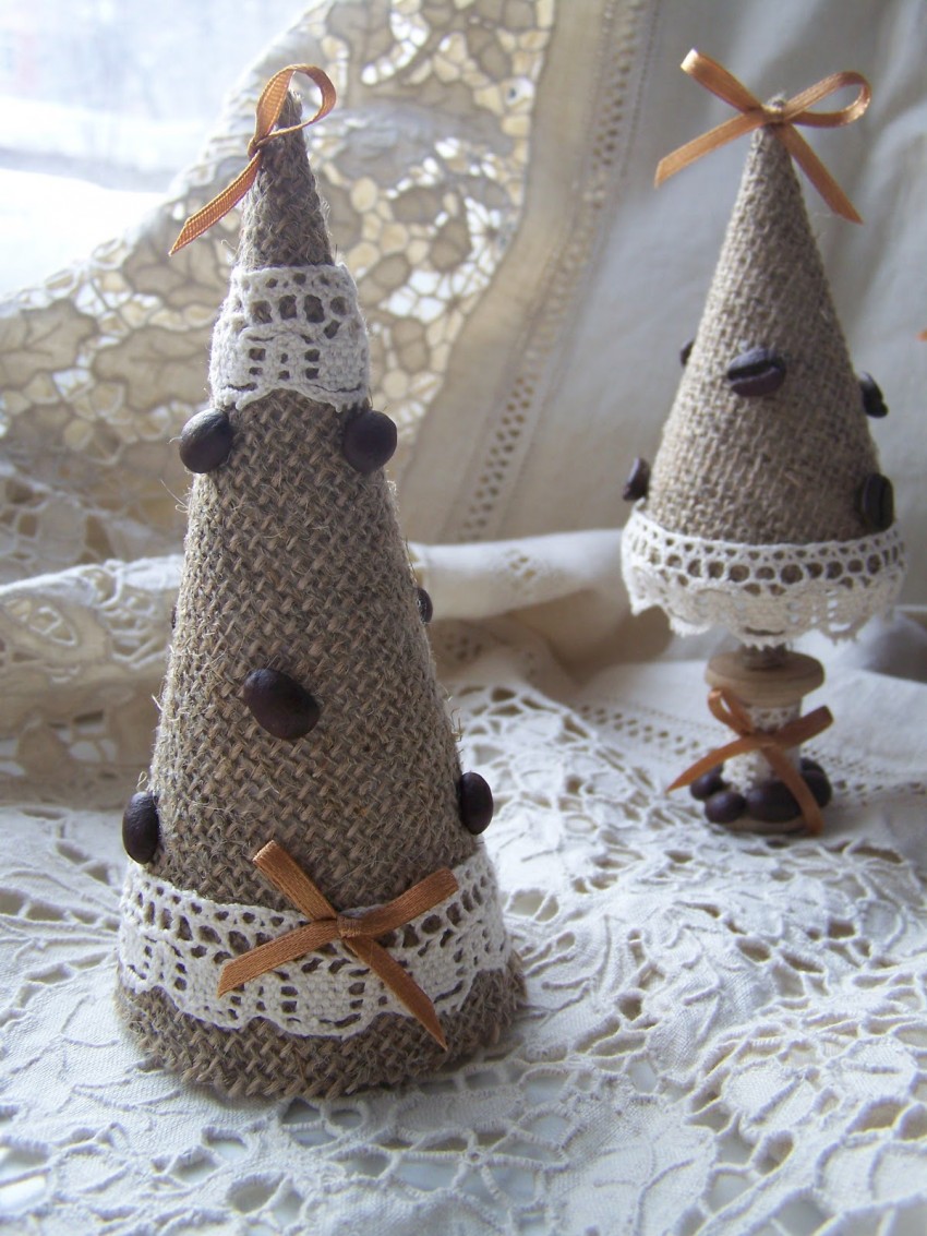 Поделка елка, сделанная своими руками из мешковины особенно привлечет к себе внимание. Для работы делаются заготовки: