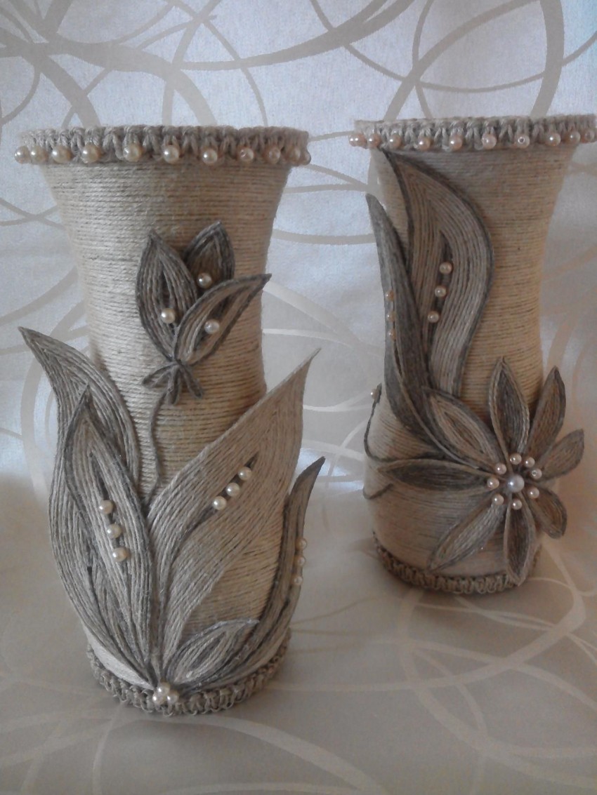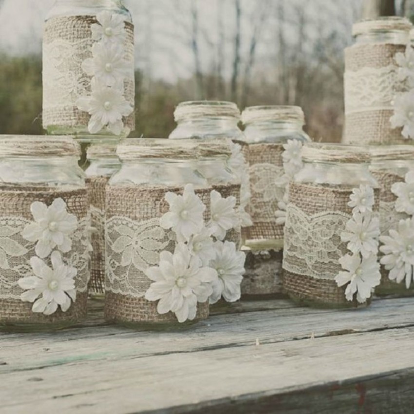 Украшения для цветочных горшков и банок со специями и крупами делаются совсем просто. Кусочком мешковины обманывают банку, закрепляют веревкой или лентой. Приветствуется любое украшение таких предметов.
