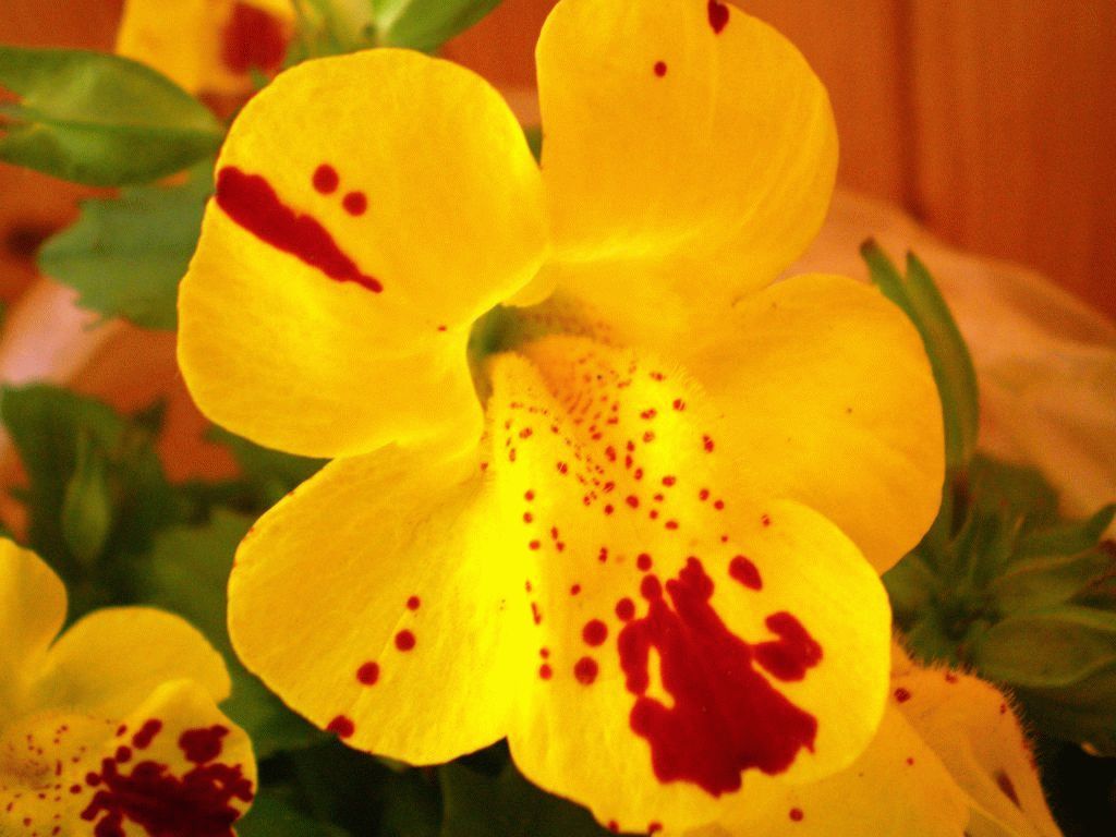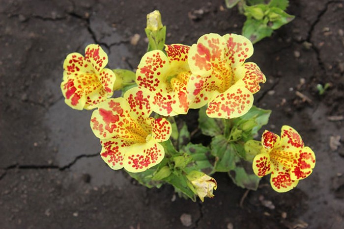 Гибрид мимулюса крапчатого и желтого. Расцветка пятнистая, цвет лимонный с алыми пятнами, вырастает до 0,3 метров.