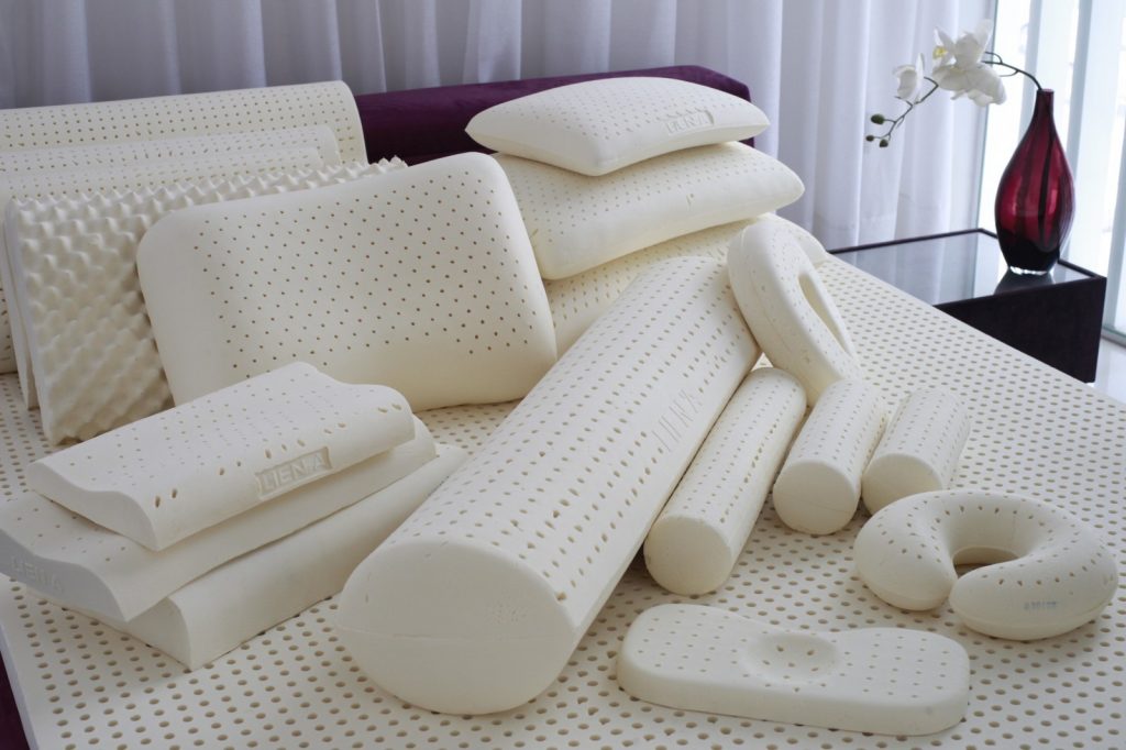 - Латексная. Является упругой и эластичной подушкой, приобретающей очертания тела. Производится в небольших габаритах, легко очищается, гипоаллергенная.