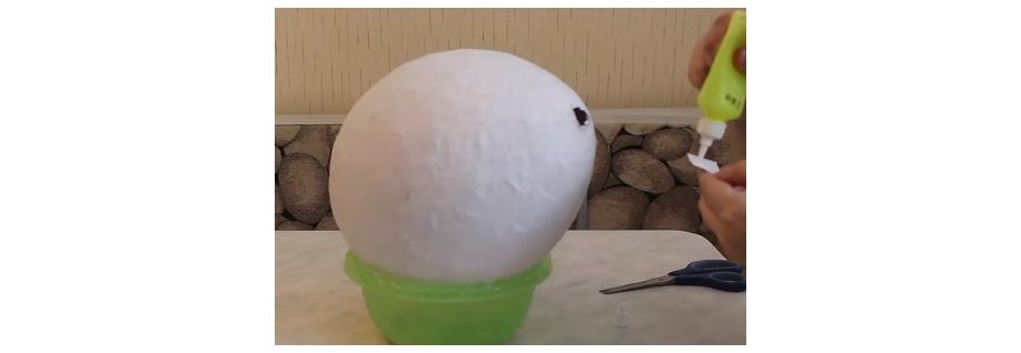 Теперь берем шерстяные нитки и делаем помпон. Пришиваем его к шапке. Ее фиксируем к крышке на голове снеговика клеем.