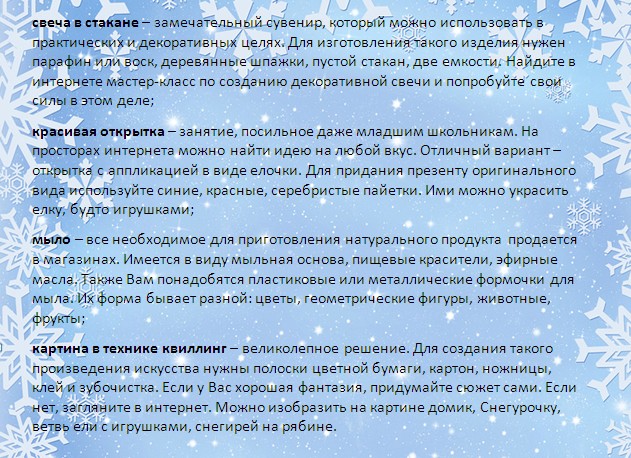 Водоворот новогодних праздников и предшествующие ему распродажи вытягивают из нас все силы и средства, заставляя напрочь счищать прилавки магазинов, чтобы запастись подарками для всех друзей и родственников. Бездушные подарочные наборы, купленные в соседнем супермаркете, не приносят радости ни дарителю, ни получателю. Стильные и оригинальные подарки своими руками станут настоящим спасением из этой ситуации, ведь эти приятные мелочи нравится и создавать, и получать.