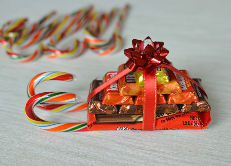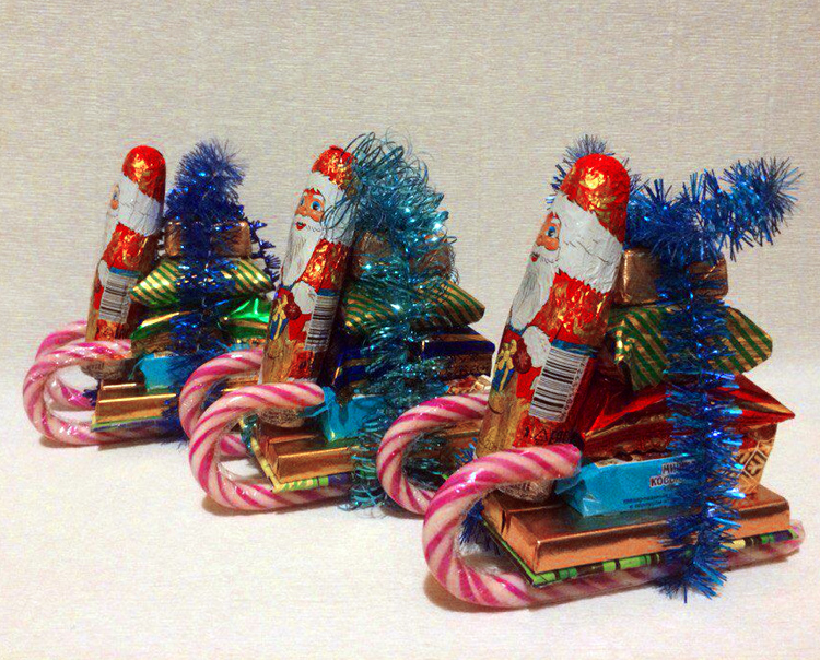 Для того, чтобы догадаться, как из кучки конфет сотворить чудесные сани, достаточно взглянуть на фото готового изделия, ведь все максимально просто: